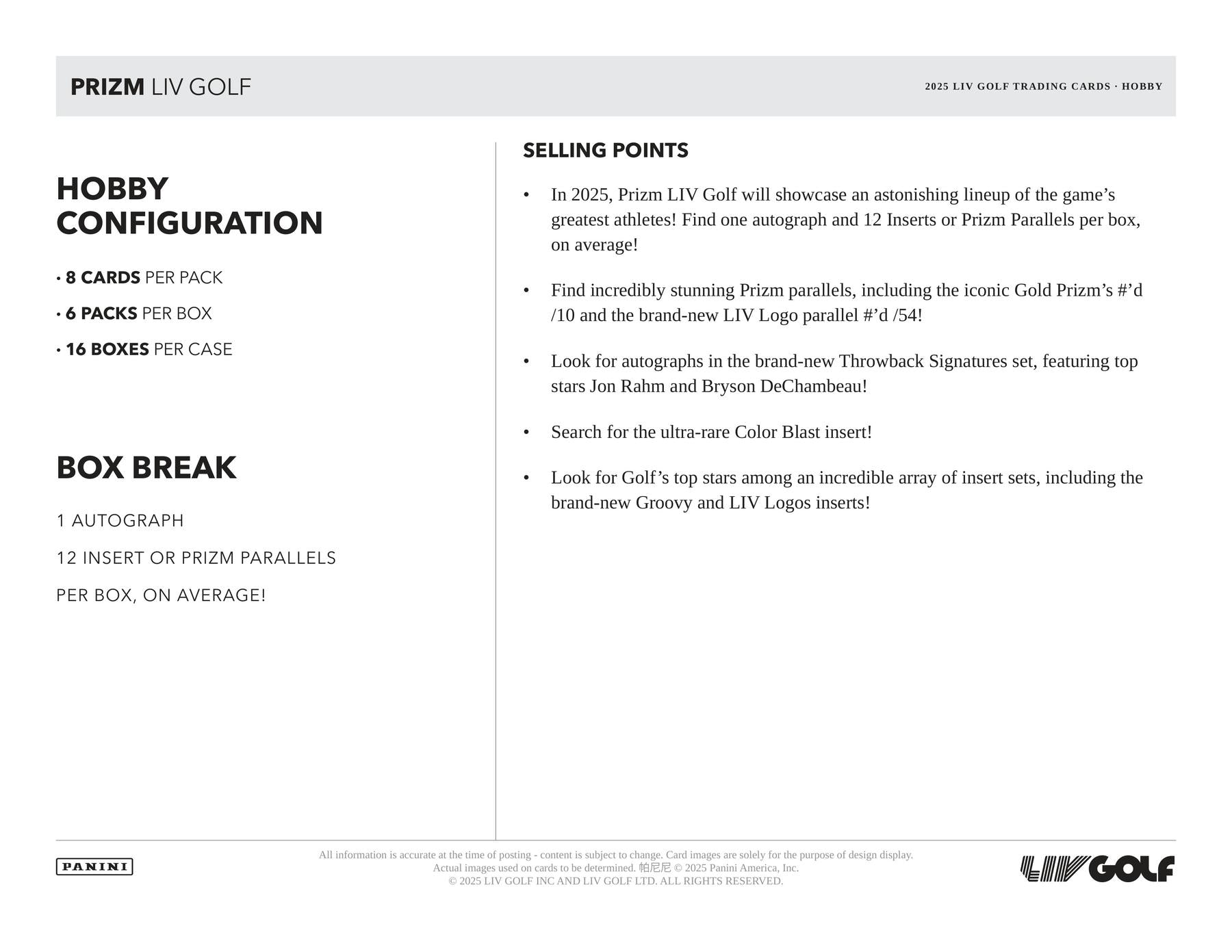 In 2025, Prizm LIV Golf will showcase an astonishing lineup of the game’s greatest athletes! Find one autograph and 12 Inserts or Prizm Parallels per box, on average!